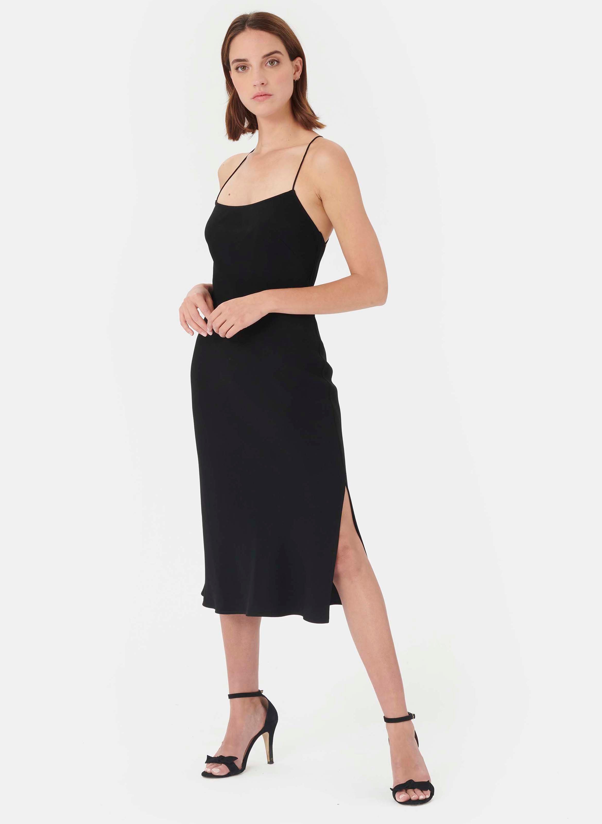 Style with clear heels and a mini bag for a look that is sure to get you noticed. Pair this with bright heels and gold accessories for date night glam. Enza Costa for FWRD Silk Rib Strappy Asymmetric Midi Dress in Black 224.