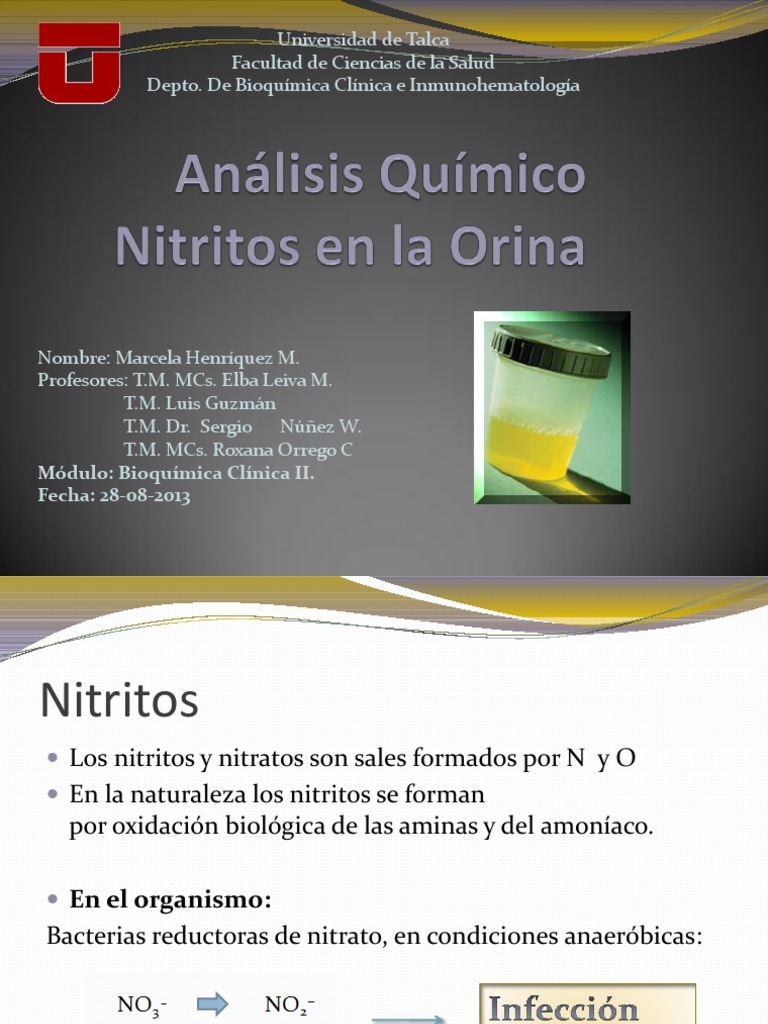 La presencia de nitratos en la orina se considera a menudo un indicador de una infección del tracto urinario ITU. Dentro de los componentes normales que se desechan a través de la orina está el nitrato este puede encontrarse en varias cantidades y no representar un problema en el organismo sin embargo los nitritos en la orina significan lo opuesto ya que su valor debe ser de cero en condiciones óptimas de salud. Los nitritos salen positivos en un parcial de orina al haber presencia de bacterias y son sustancias derivadas del metabolismo propio de ellas su presencia hace pensar en una infección urinaria en curso si se ha tomado adecuadamente la muestra.
